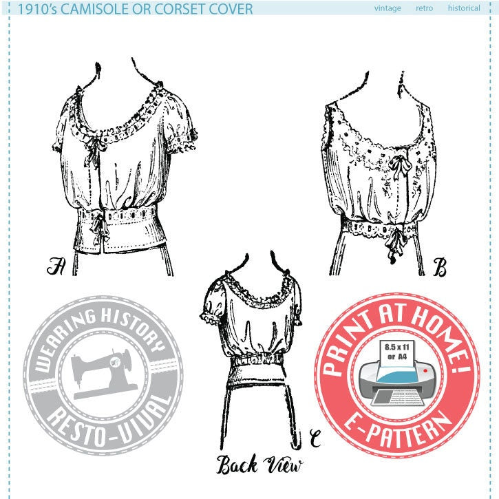 Circa 1910s Camisole or Corset Cover E- Pattern. This e-pattern is formatted to print at home on US Letter or A4 paper. Also includes copy shop A0 size files to be sent away.