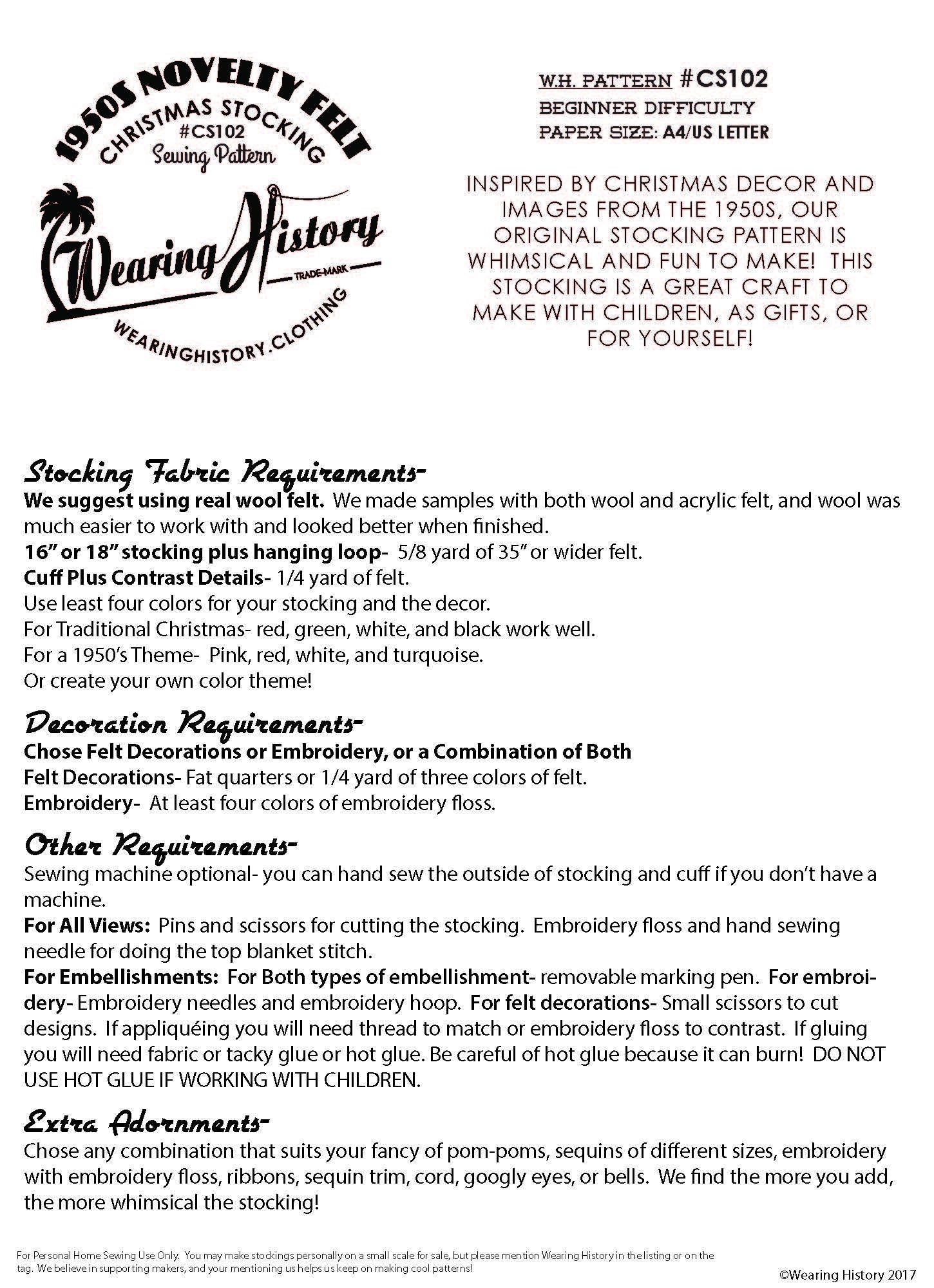 Make your Christmas whimsical with a 1950's inspired novelty felt stocking! An original Wearing History design inspired by 1950's graphics and designs, this pattern is made from felt and can be decorated with felt and embroidery.
