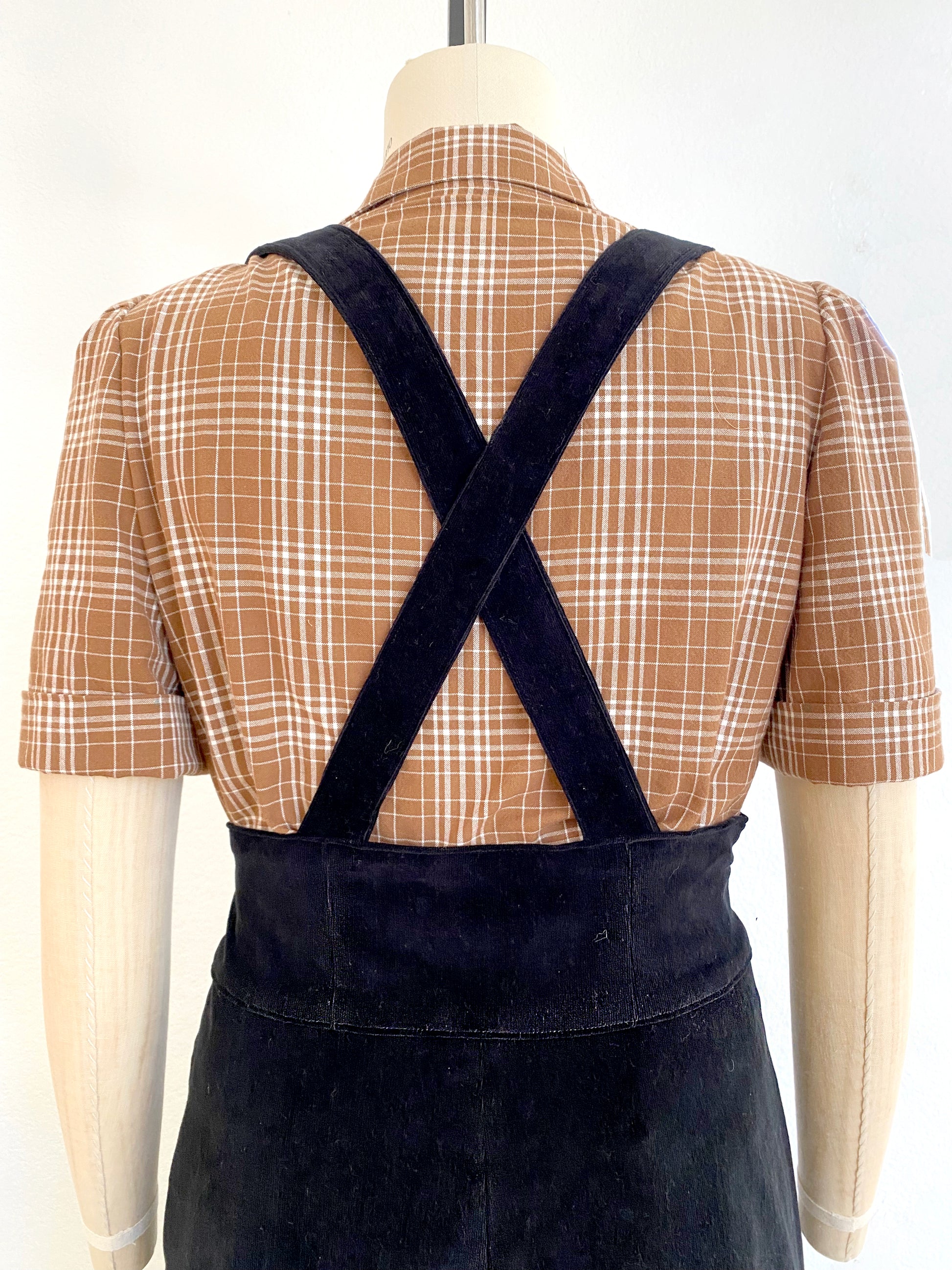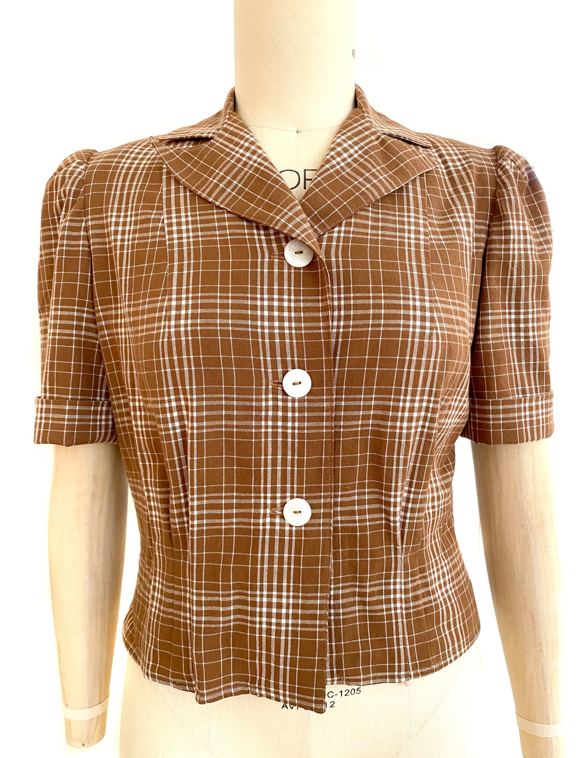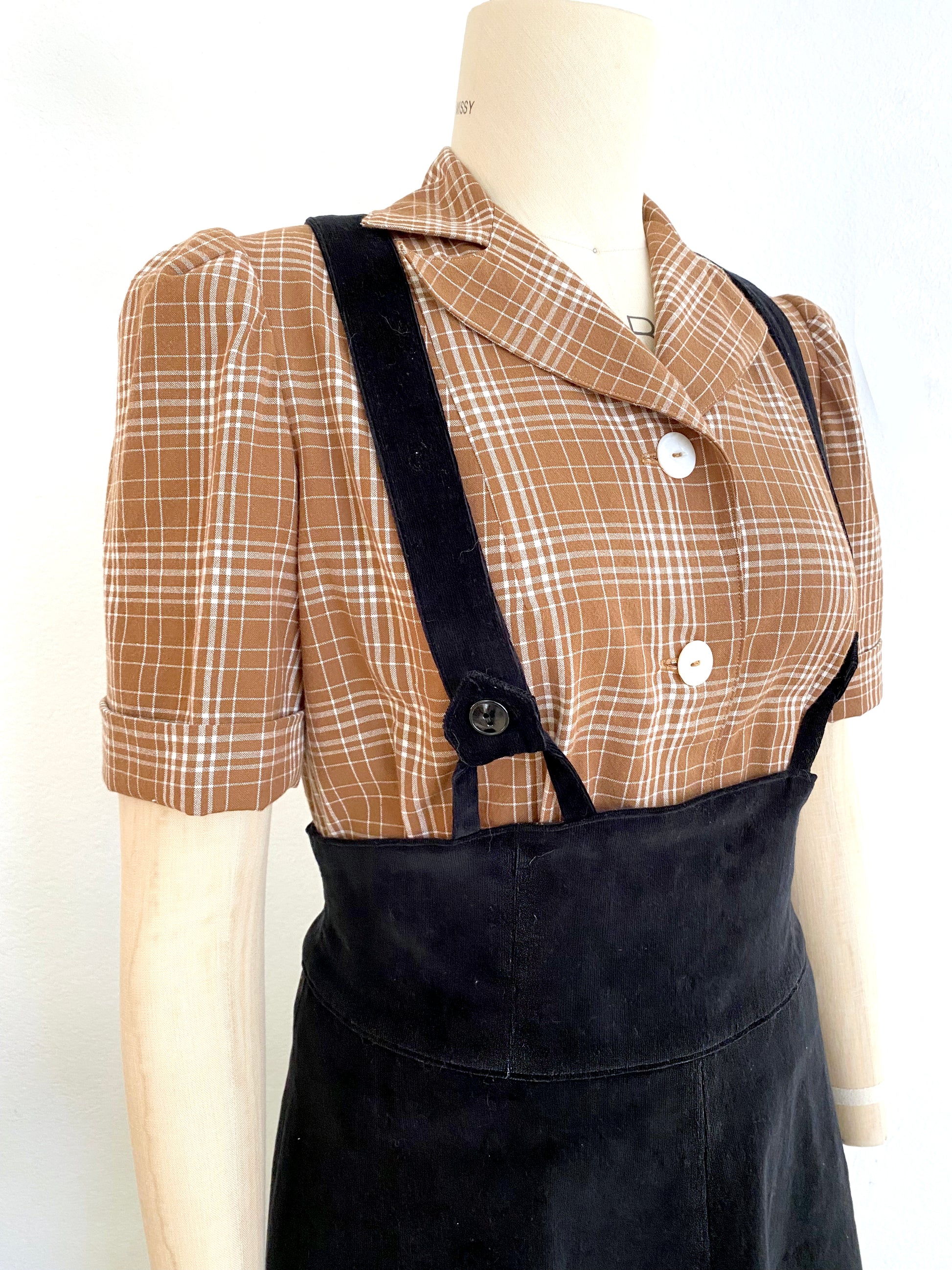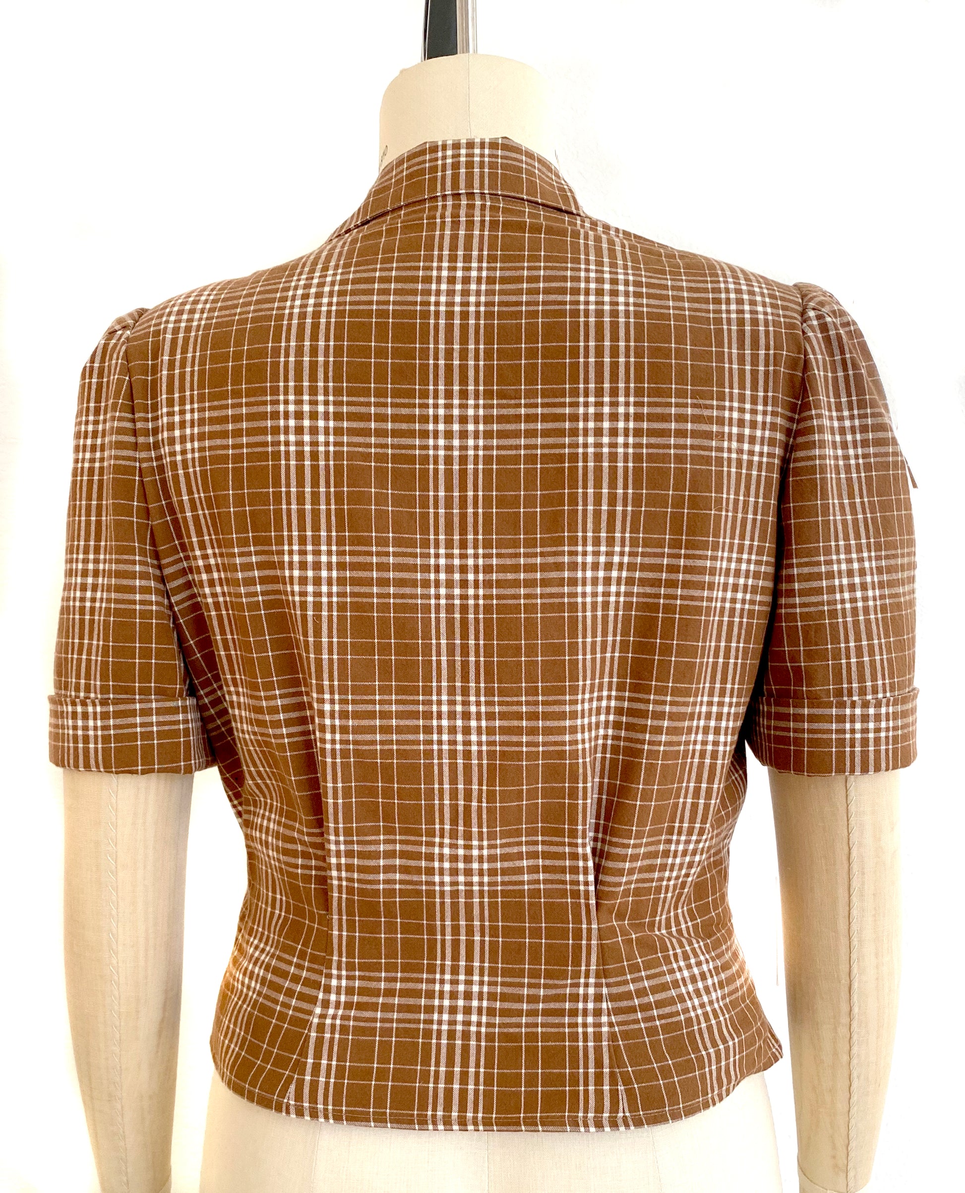Please be aware- Vintage garment of this period fit *very differently* than garments today. This retains the original 1940s fit!  The skirt most likely will require fitting for your unique figure because of the placement of the smallest part of the waistline towards the center of the "yoke", and sleeves may require alterations for comfort.  You may wish to add length to the lower edge of the blouse.  This blouse retains the vintage fit and styling to preserve authenticity.