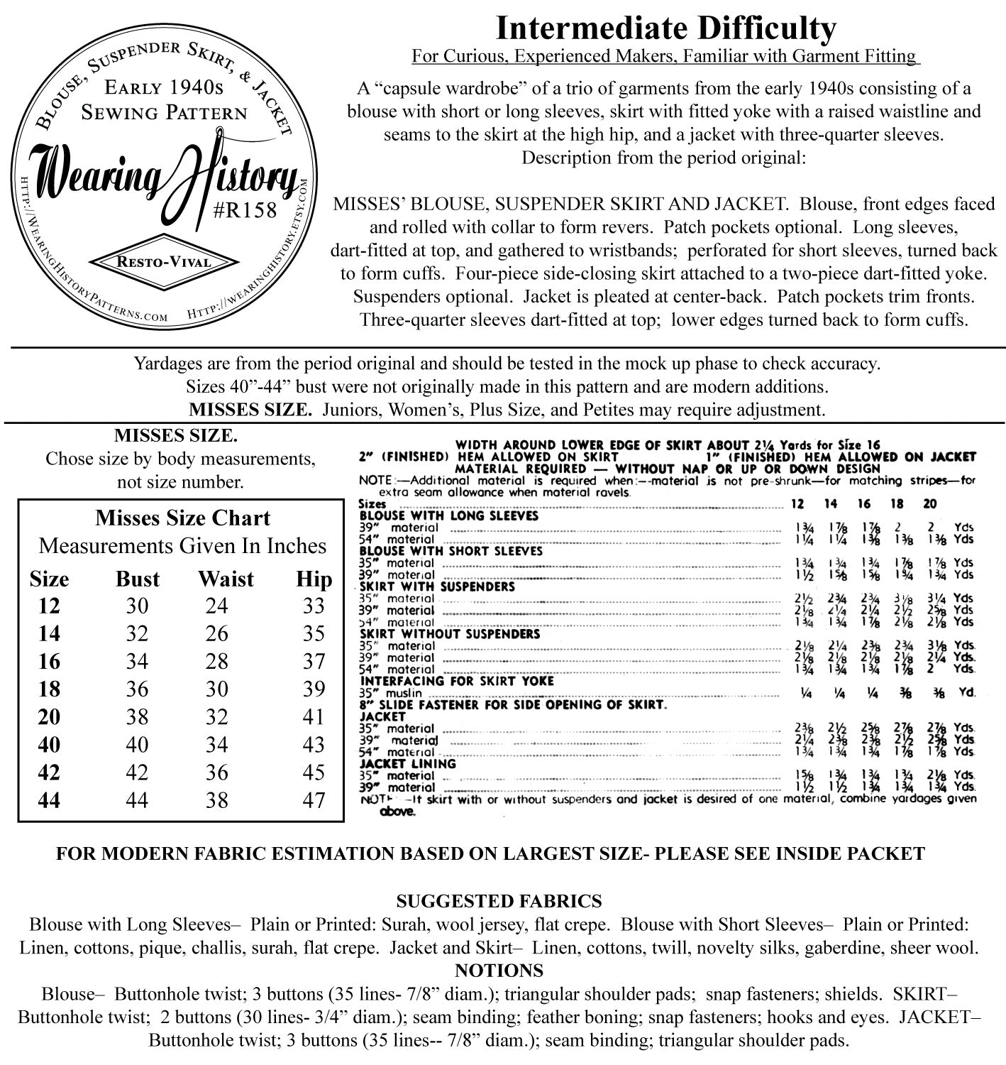 R158- Early 1940s Blouse, Suspender Skirt, & Jacket pattern.