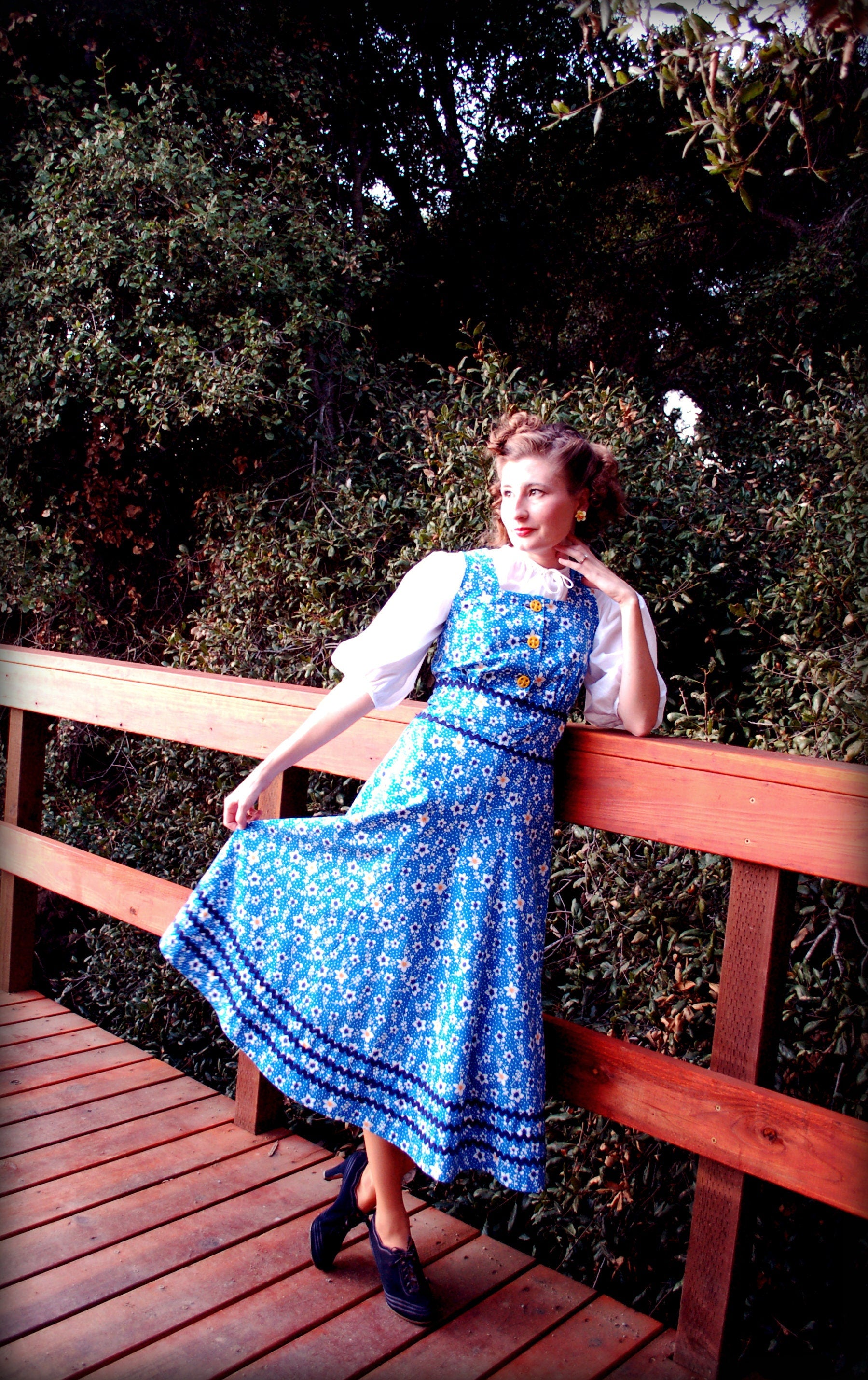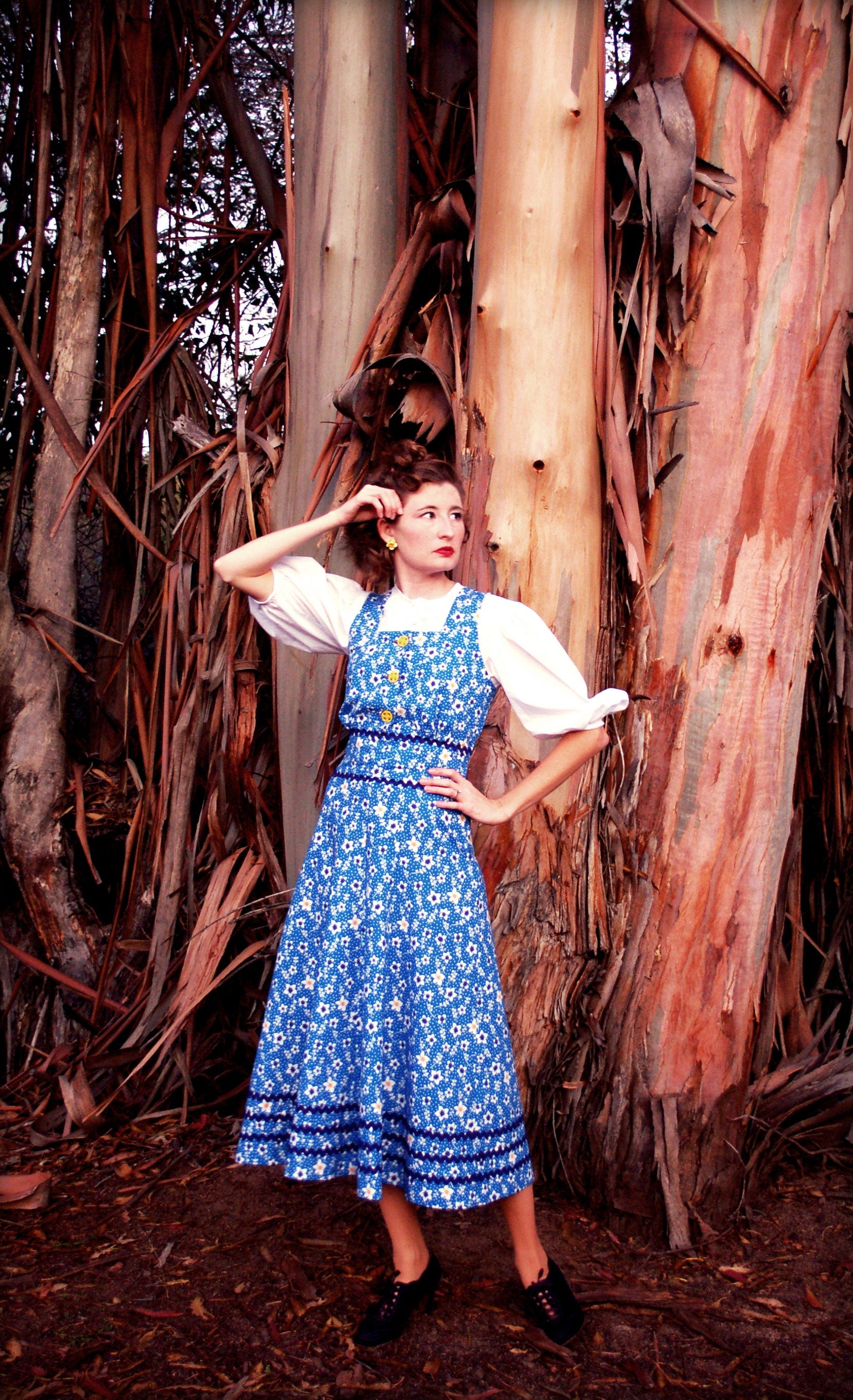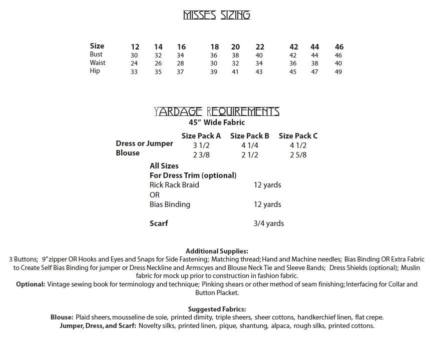 The dress or jumper has a square neckline and buttons up the front. The waist has a fitted inset belt which creates the high waistline effect. The skirt of the dress is very fitted at the hip, from which it flares out for fullness. This dress fastens up the side with a slide fastener or hooks and eyes and snaps. The bodice neckline and armscye is finished with bias binding. The jumper is created from the same pieces as the dress, but the armscyes and shoulders are cut in to be narrower at the shoulder than the dress version. The dress or jumper may be trimmed with rows of bias binding or rick rack trim. Please note the placement for the trim are not indicated on the pattern pieces, but instructions for adding trim are included in the instruction pack. This pattern can easily carry you into looks from the early 1940s by shortening the skirt hem length. Cutting instructions for a matching scarf are also included. Perfect for cottage core, fairy tale, folk art looks, too!