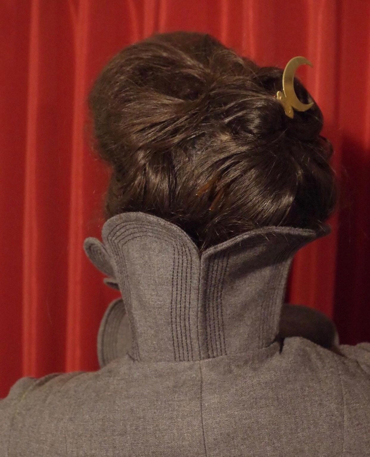 An elegant jacket, from the year 1899, that is ideal for late Victorian, early Edwardian, and steampunk looks. This jacket has a flared Medici collar with petal detail, circular cuffs, and scalloped hem. The jacket may be accented by rows of top-stitching. Works well in wool, linen, or cotton for both the fashionable lady or the lady adventurer.