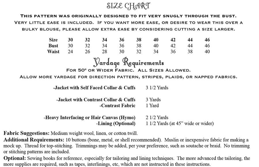 This pattern has been trued up from the original pattern and includes the addition of multi-sizes, seam allowance, grain lines, notches, facing pieces, and pattern markings which were not originally included. This pattern has been supplemented with my illustrations and text to make basic, untailored construction easier to comprehend. Basic lining instructions are included, but are not in-depth. If you desire more tailoring or lining instruction, it is suggested to supplement this pattern with a book that instructs tailored garment construction.