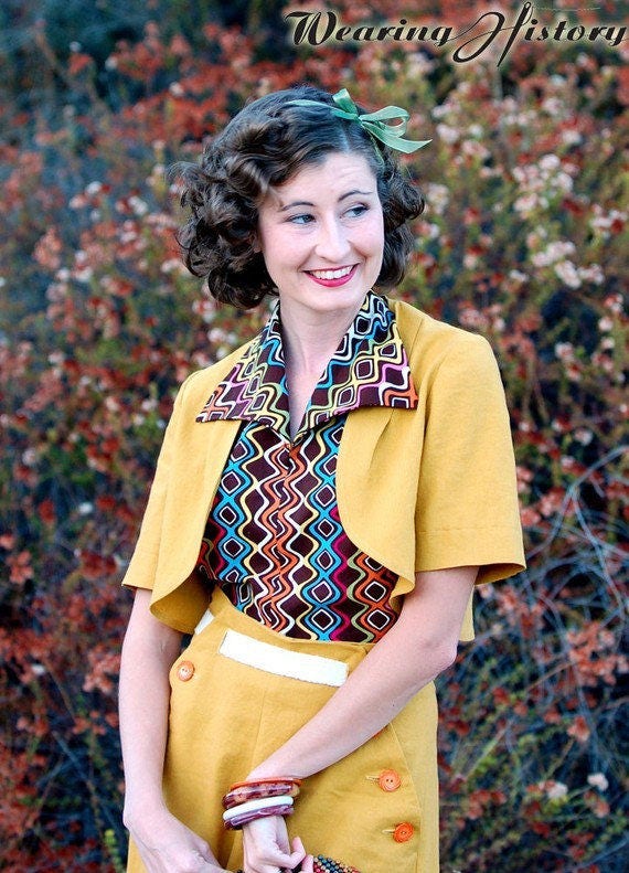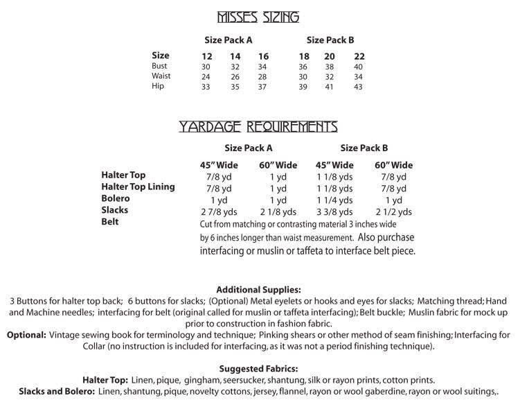 This "Resto-Vival" pattern dates to about 1937 for nautical inspired slacks that lace up with eyelets at the inside center front waist and are held up at the outside with large buttons and a belt that passes through a bound buttonhole. This pattern also includes a cute halter top with a wide collar and a bolero jacket! The slacks can be made in two different lengths.