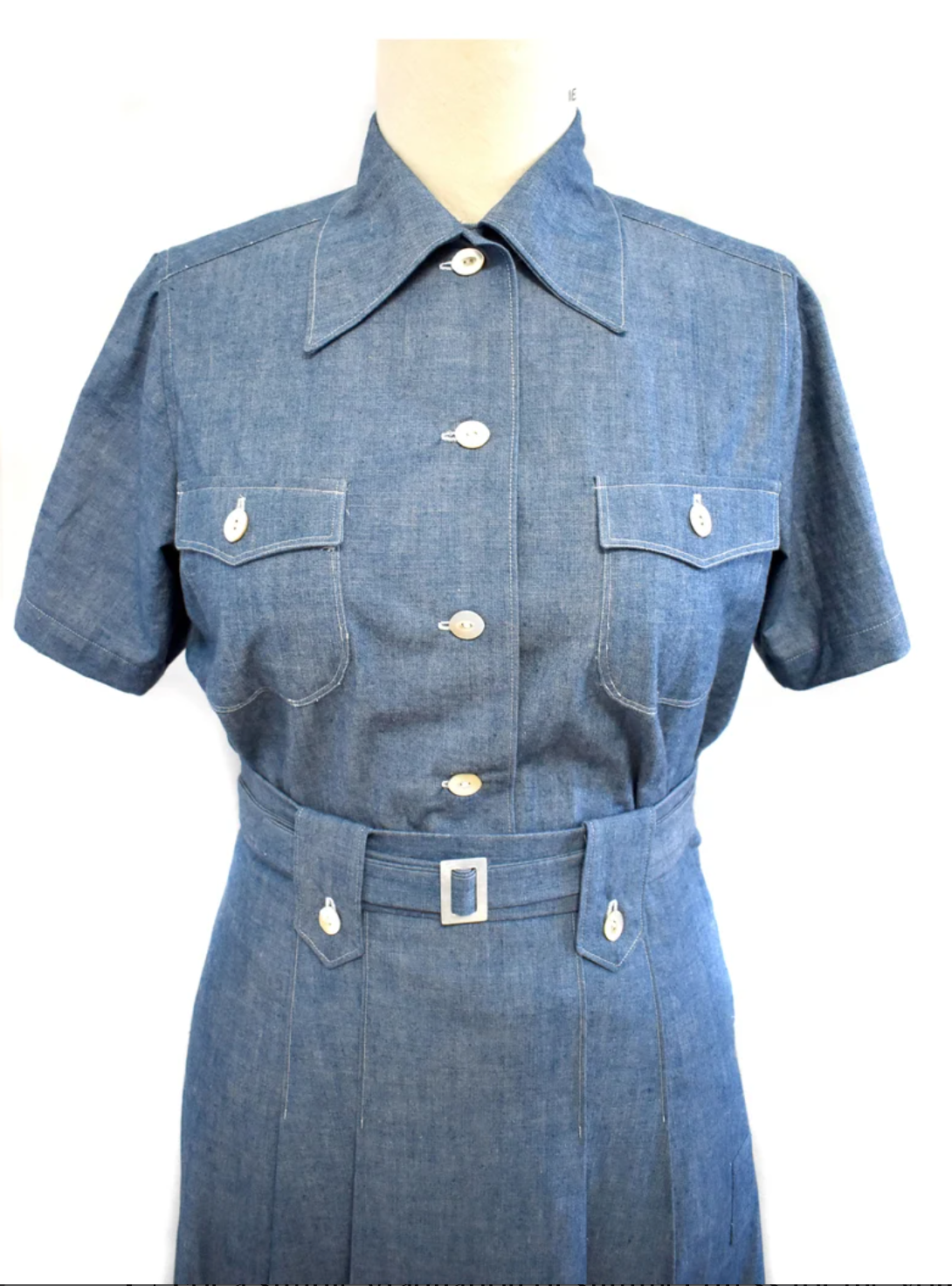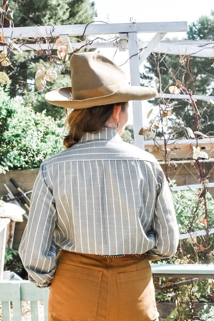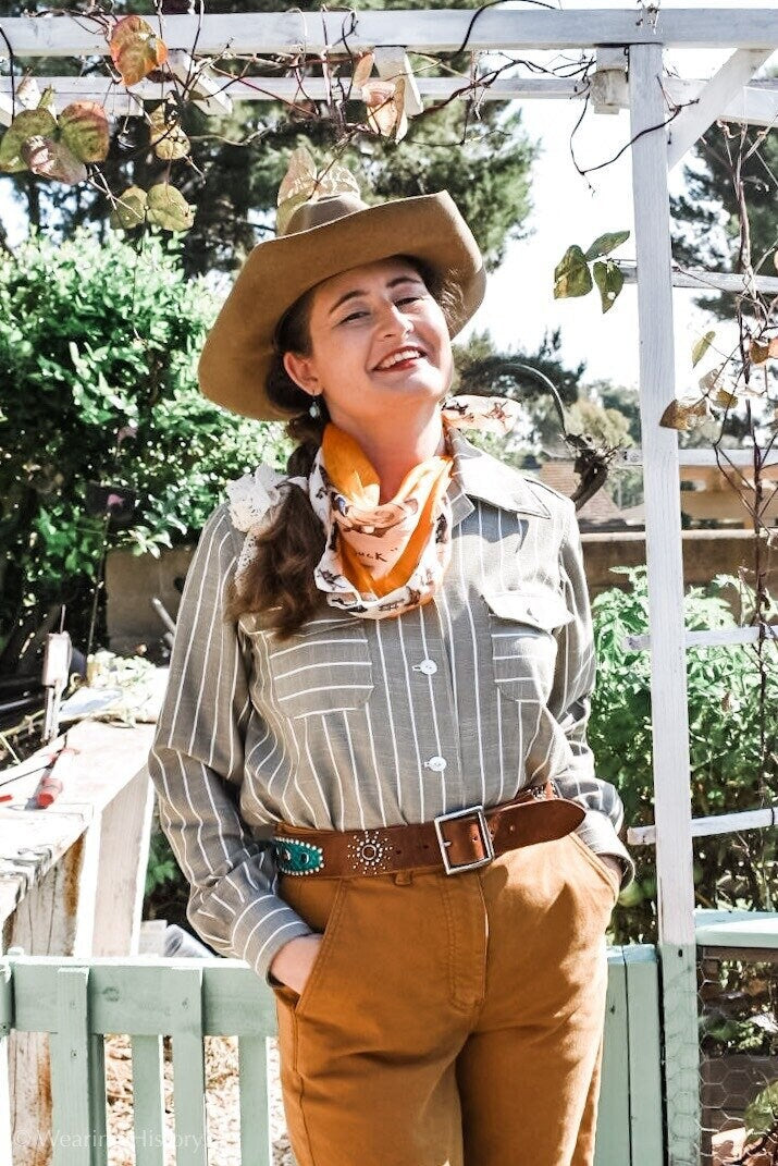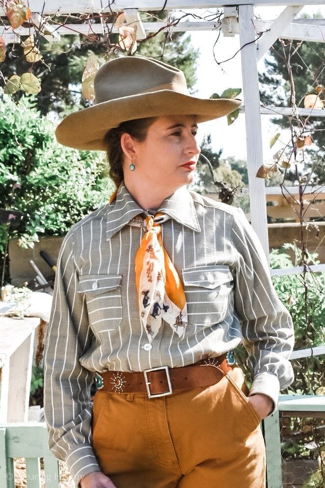 This subtly western-inspired skirt and blouse duo from the first part of the 1940s is perfect as a wardrobe basic.The skirt is pleated and has tabbed belt loop accents. The blouse has a yoke, patch pockets with flaps, and can be made with long or short sleeves. Use it as a base for your creative embroidery on the pockets, yoke, and cuffs- or keep it simple to use it as the base for your everyday 1940s wardrobe.