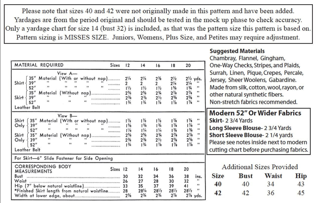 This is a Wearing History Resto-Vival pattern and is based on an original period sewing pattern. This pattern includes sizes 30"-42" bust all in the same packet. Size 40" and 42" bust were not originally made in this sewing pattern and are modern additions. This pattern includes the original period instructions, which are fairly minimal, and the addition of a modern cutting chart for 52" wide or wider fabrics.
