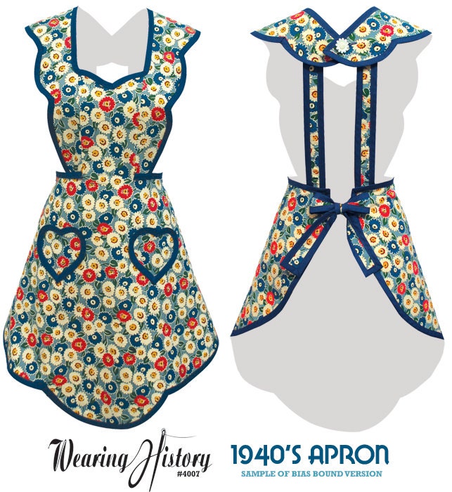 I'm pleased to offer the first Beginner difficulty pattern from Wearing History! This pattern features a cute scalloped apron skirt that is cut on the bias, scalloped shoulder straps that attach with a button at the back, two back straps, and ties! This pattern can be made either in one fabric or in two contrasting fabrics. The apron can either be finished with bias binding or with bias facing.