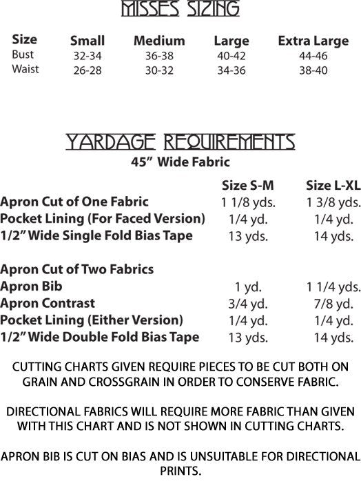 This pattern was based on an original period 1940s pattern but has been extensively updated while still retaining a period fit. included are step-by-step illustrated instructions, cutting layouts for modern 45" fabric widths, and multiple sizes per packet. Sewing both versions of this apron calls for pre-made purchased bias binding. It is suggested to have a little knowledge on mitering corners of bias binding or facing to make these aprons, as the binding/facing is the most difficult part of construction. As an extra bonus, I am adding bias binding and bias facing photo tutorials to my blog to help with apron construction. You can find the how-to posts here.