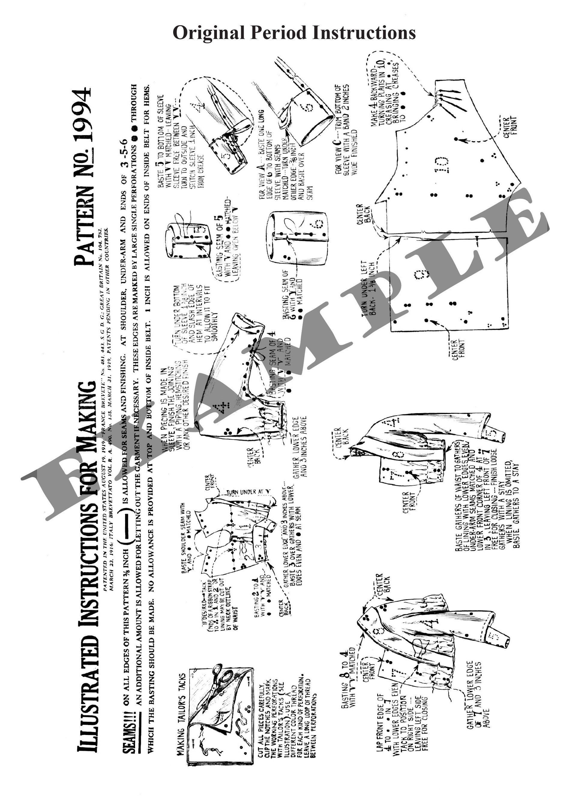 Included are original period instructions that are illustrated but still sparse. You may wish to have a sewing book handy for detailed techniques. This is complicated construction with a dress built over a bodice lining with hidden closures.