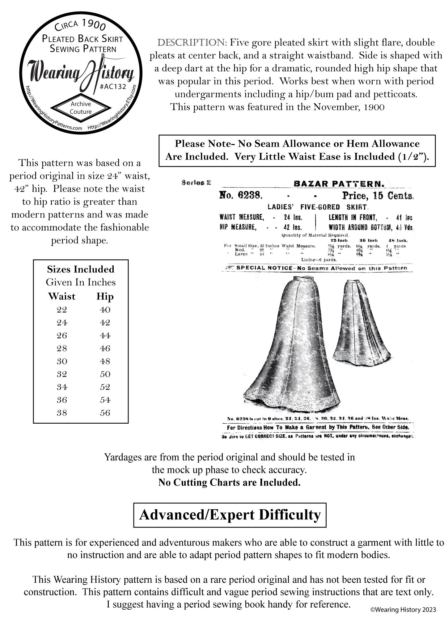 Description: Five gore pleated skirt with slight flare, double pleats at center back, and a straight waistband. Side is shaped with a deep dart at the hip for a dramatic, rounded high hip shape that was popular in this period. Works best when worn with period undergarments including a hip/bum pad and petticoats as the hip to waist ratio are quite a bit greater than modern patterns. Please see the photos for a size chart.