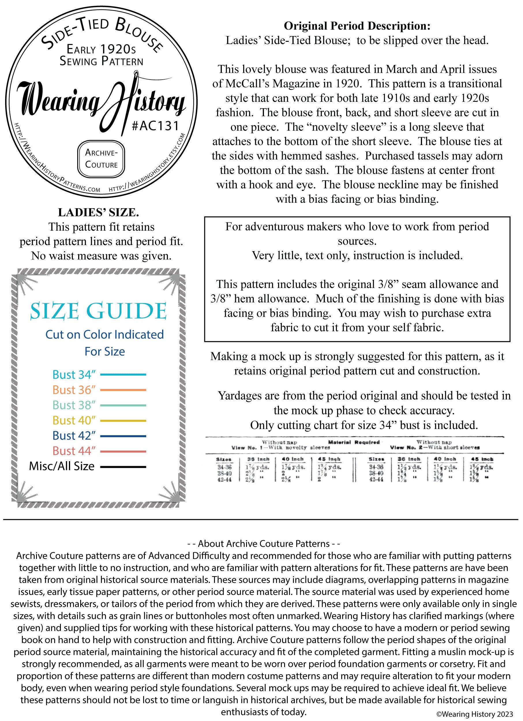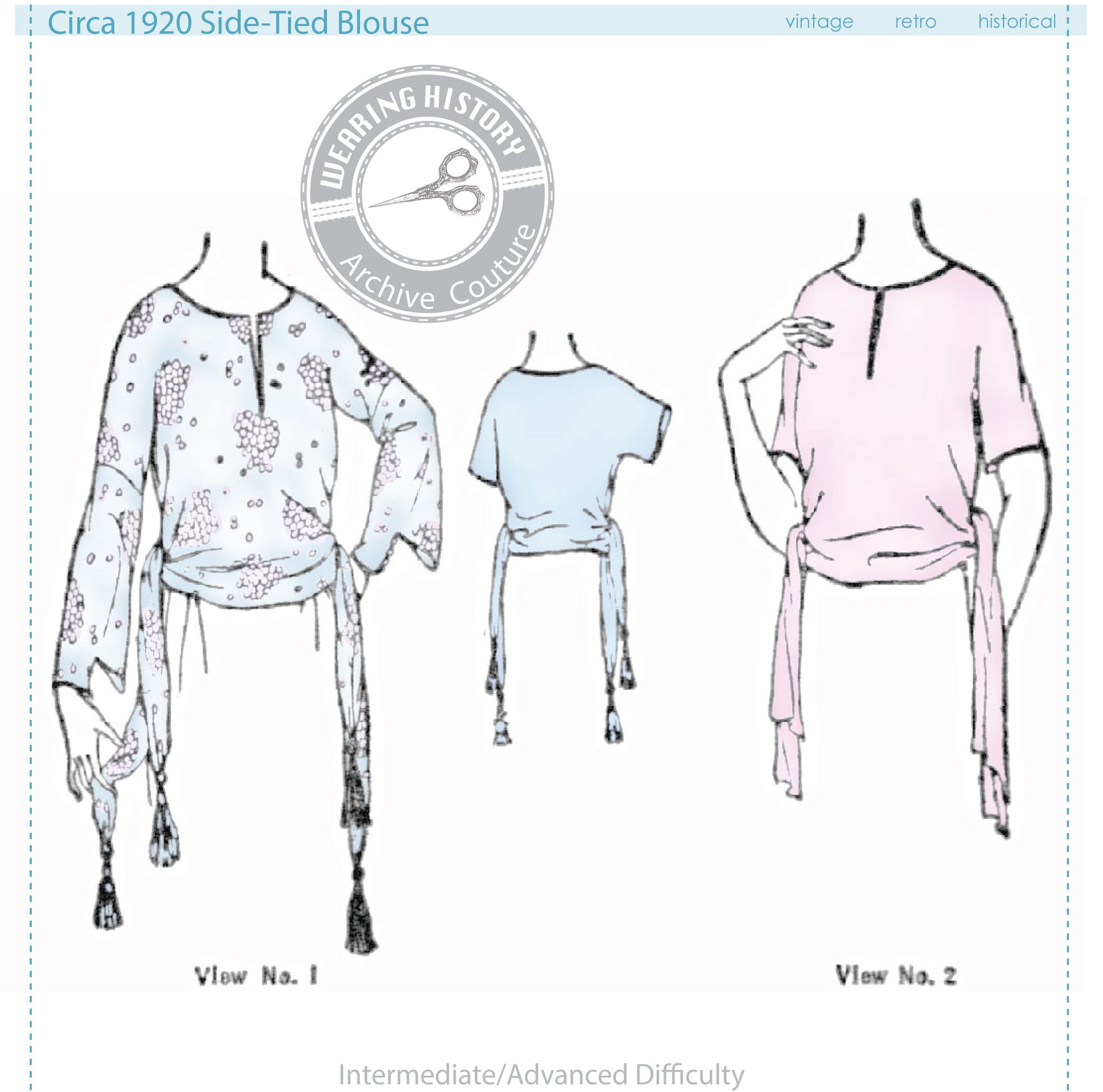 Intermediate to Advanced difficulty. This blouse has the original period instructions that are text-only. You must be able to sew and finish a blouse with very minimal, text only instruction. You may wish to have a sewing book handy for detailed techniques.