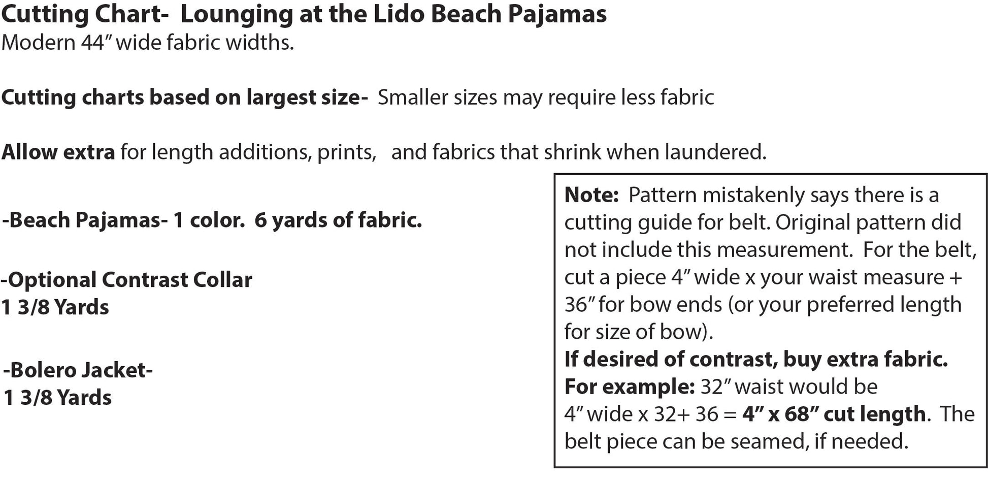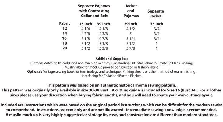 This pattern was based on a vintage size 16 (bust 34) original historic pattern. This pattern was originally only available in sizes 30 inch to 38 inch bust and yardage requirements are given only for those sizes. A cutting guide is included only for size 16 (bust 34). For all other sizes please use your discretion when buying fabric lengths, and all other sizes will need to create their own cutting layout. The trouser pieces are very large and it is suggested to use at least 45" wide fabric for size packs B and C.